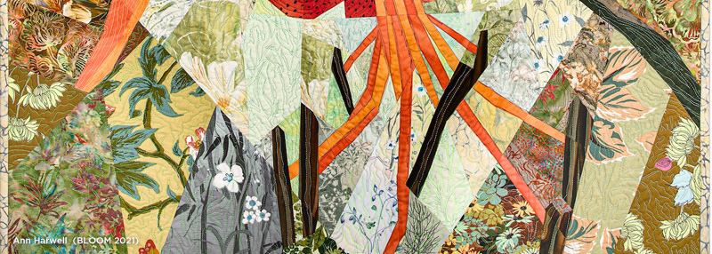 Featured Artwork: Detail image from Amy Genser: Shifting, Lynne Sausele “Duck Duck” from 2022 Craft Biennial, detail image of Dora Hsiung “100 Golden Years” from Weaver’s Guild of Boston.