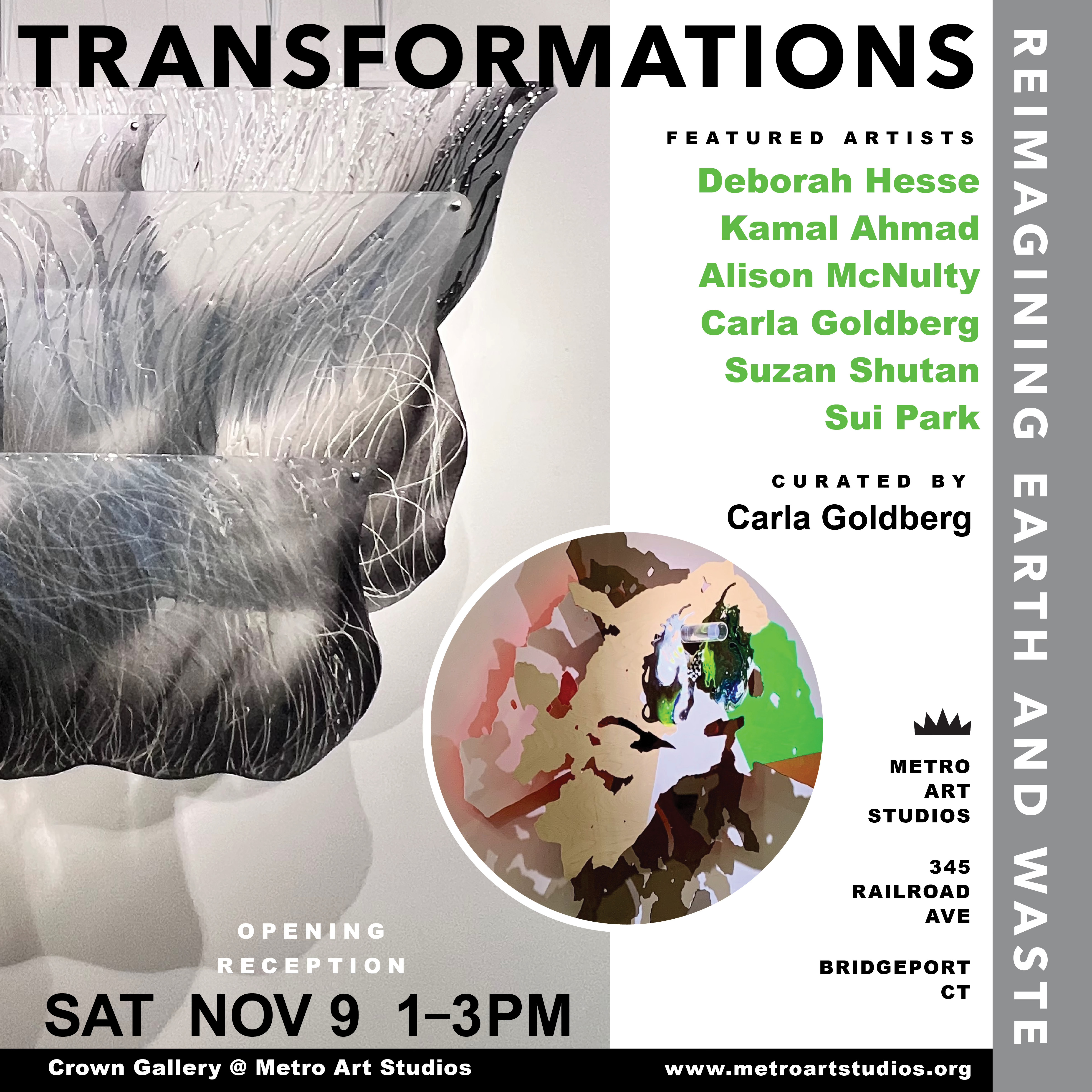 | TRANSFORMATIONS ART EXHIBIT. The Crown Gallery at Metro Arts Studios is proud to present Transformations: Reimagining Earth and Waste, an immersive exhibition curated by renowned mixed media artist and independent curator Carla Goldberg. The exhibition brings together six visionary installation artists who transform discarded and natural materials into compelling works that provoke thought and inspire action. Participating artists include Deborah Hesse, Kamal Ahmad, Alison McNulty, Carla Goldberg, Suzan Shutan, and Sui Park. This exhibition is not just a visual experience—it is a call to action, encouraging us all to reconsider our role in sustainability and to see the potential in the discarded. Through the transformative visions of these six artists, Transformations offers a glimpse into a more hopeful, regenerative future. The exhibit runs through January 11, 2025 |